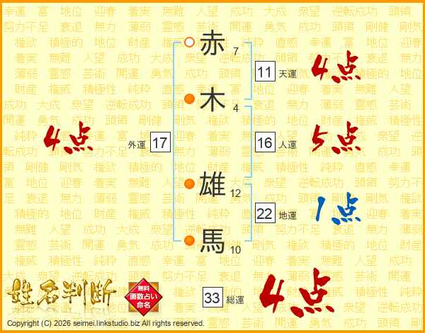赤木雄馬さんの総運は33画の4点!