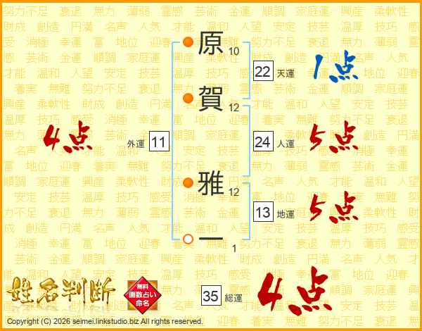 生活面を象徴する運勢です。外部から受ける影響力を表し、結婚運、家庭運や職場、環境への順応性を表します。総運から人運を引いた画数。姓や名が1文字の場合を除く。