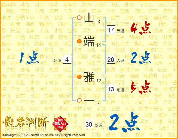 生活面を象徴する運勢です。外部から受ける影響力を表し、結婚運、家庭運や職場、環境への順応性を表します。総運から人運を引いた画数。姓や名が1文字の場合を除く。