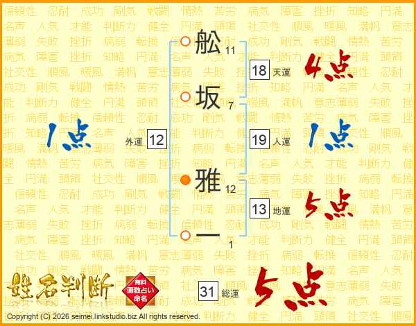 舩坂雅一さんの総運は31画の5点!