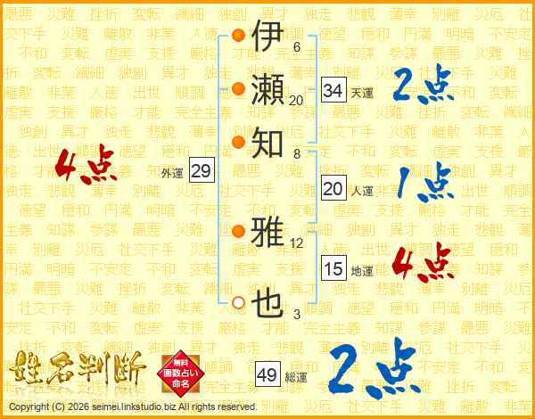 伊瀬知雅也さんの総運は49画の2点!