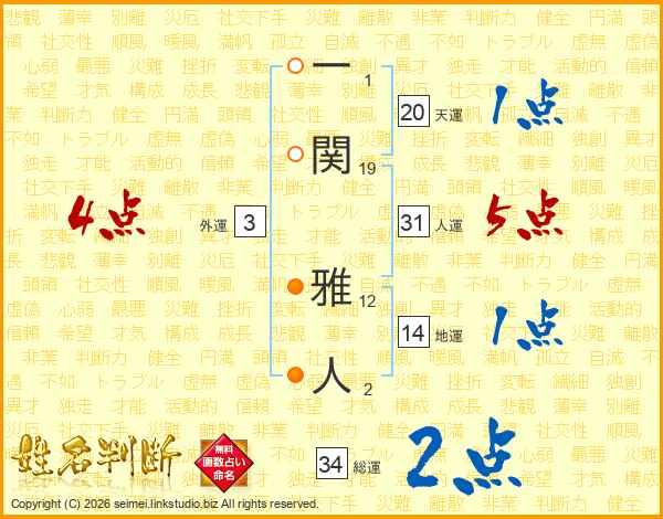 生活面を象徴する運勢です。外部から受ける影響力を表し、結婚運、家庭運や職場、環境への順応性を表します。総運から人運を引いた画数。姓や名が1文字の場合を除く。