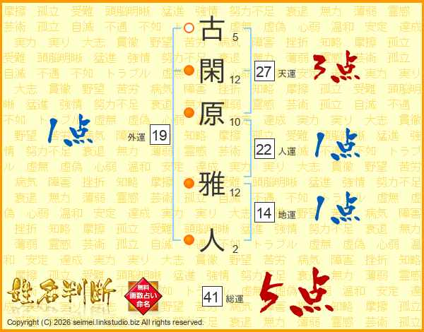 古(5画)閑(12画)原(10画) 雅(12画)人(2画)