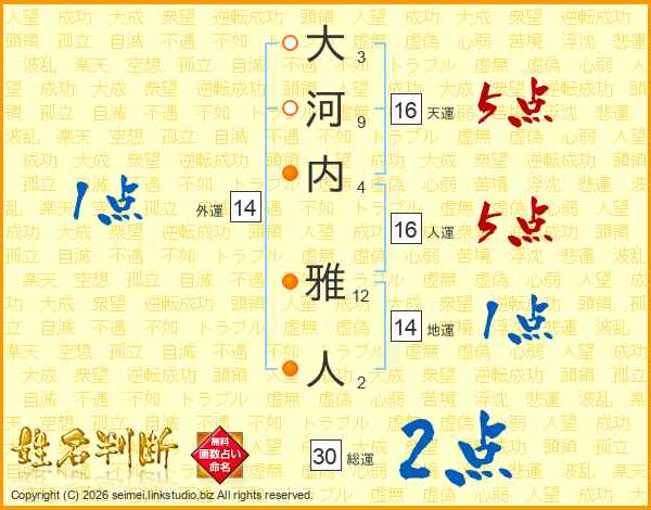 大(3画)河(9画)内(4画) 雅(12画)人(2画)