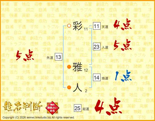 あなたの人生を表す1番重要な運勢です。生涯を通じて影響する総合運となり、主に50歳以降の晩年期に影響を及ぼします。苗字と名前の合計画数。