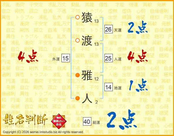 猿(13画)渡(13画) 雅(12画)人(2画)