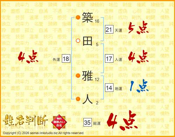 築(16画)田(5画) 雅(12画)人(2画)
