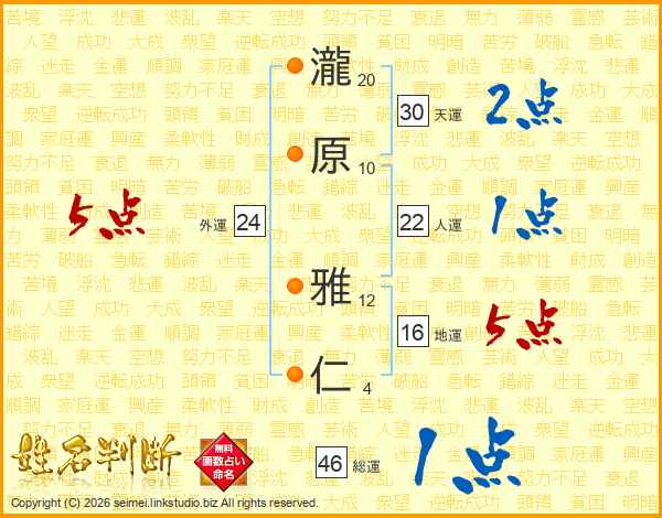 瀧(20画)原(10画) 雅(12画)仁(4画)