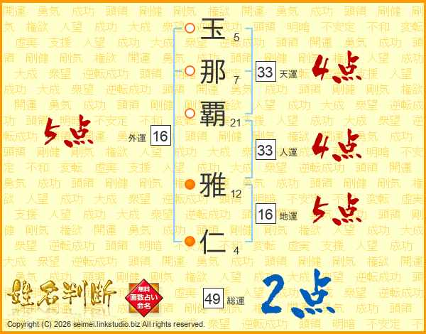 玉(5画)那(7画)覇(21画) 雅(12画)仁(4画)