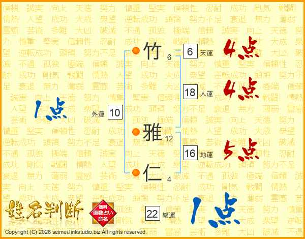 生活面を象徴する運勢です。外部から受ける影響力を表し、結婚運、家庭運や職場、環境への順応性を表します。総運から人運を引いた画数。姓や名が1文字の場合を除く。