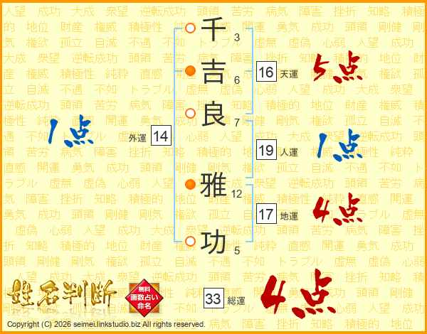 千(3画)吉(6画)良(7画) 雅(12画)功(5画)