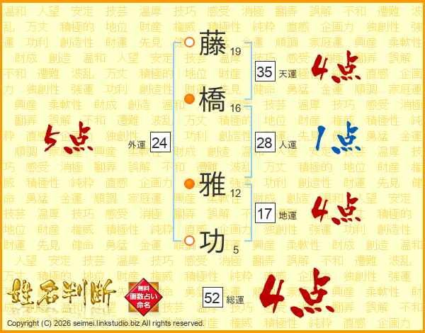藤(19画)橋(16画) 雅(12画)功(5画)