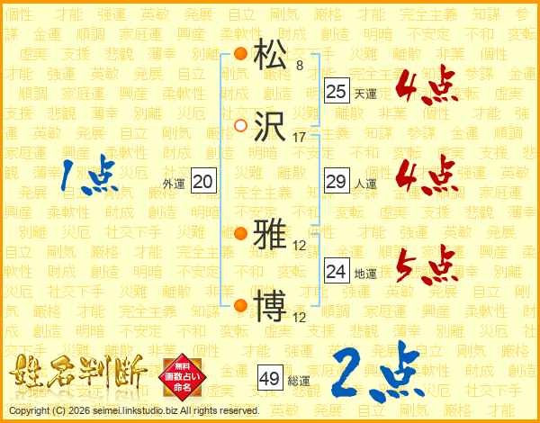 松(8画)沢(17画) 雅(12画)博(12画)