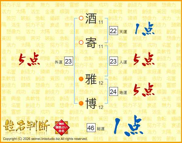 あなたの人生を表す1番重要な運勢です。生涯を通じて影響する総合運となり、主に50歳以降の晩年期に影響を及ぼします。苗字と名前の合計画数。