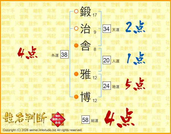 鍛治舎雅博さんの総運は58画の4点!