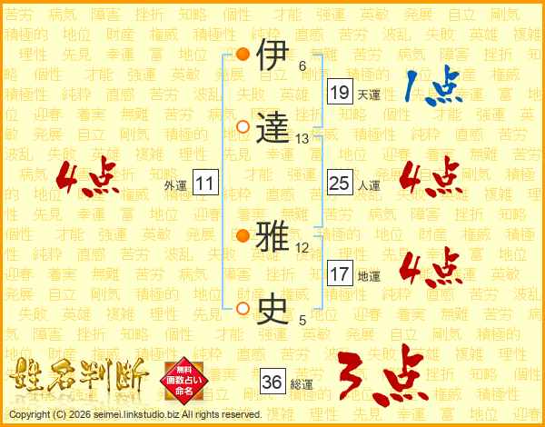 あなたの人生を表す1番重要な運勢です。生涯を通じて影響する総合運となり、主に50歳以降の晩年期に影響を及ぼします。苗字と名前の合計画数。