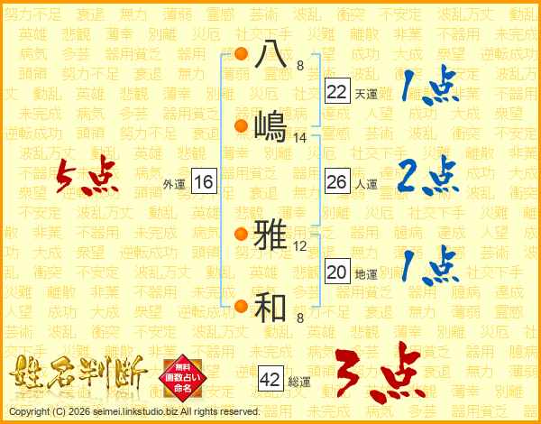 八(8画)嶋(14画) 雅(12画)和(8画)