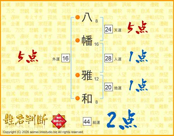 八幡雅和さんの総運は44画の2点!