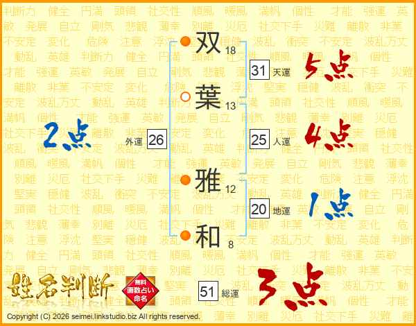 双(18画)葉(13画) 雅(12画)和(8画)