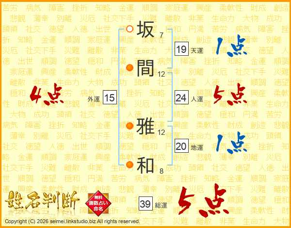 坂間雅和さんの総運は39画の5点!