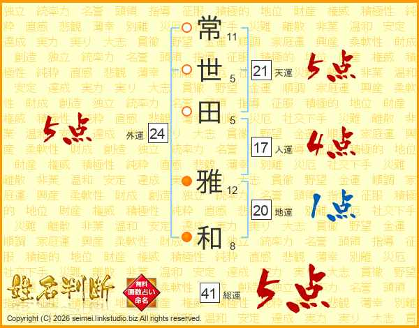常(11画)世(5画)田(5画) 雅(12画)和(8画)
