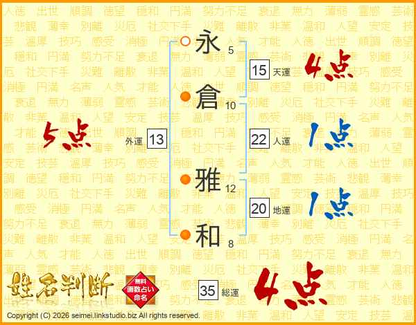 永(5画)倉(10画) 雅(12画)和(8画)