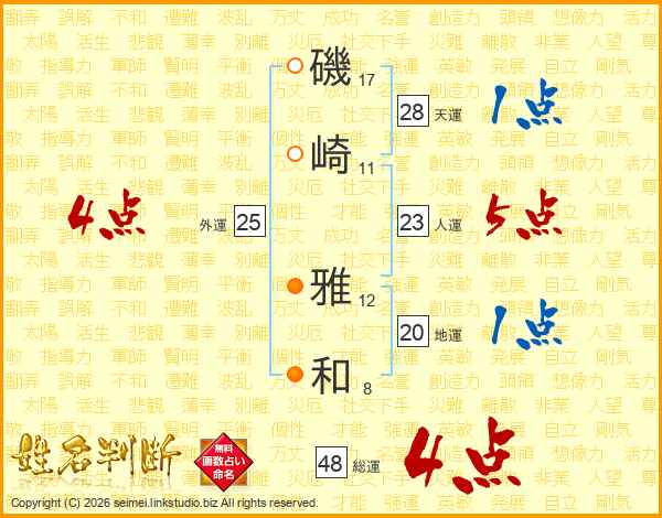 磯(17画)崎(11画) 雅(12画)和(8画)