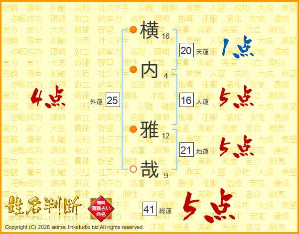 生活面を象徴する運勢です。外部から受ける影響力を表し、結婚運、家庭運や職場、環境への順応性を表します。総運から人運を引いた画数。姓や名が1文字の場合を除く。