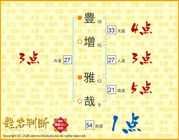 豊(18画)増(15画) 雅(12画)哉(9画)