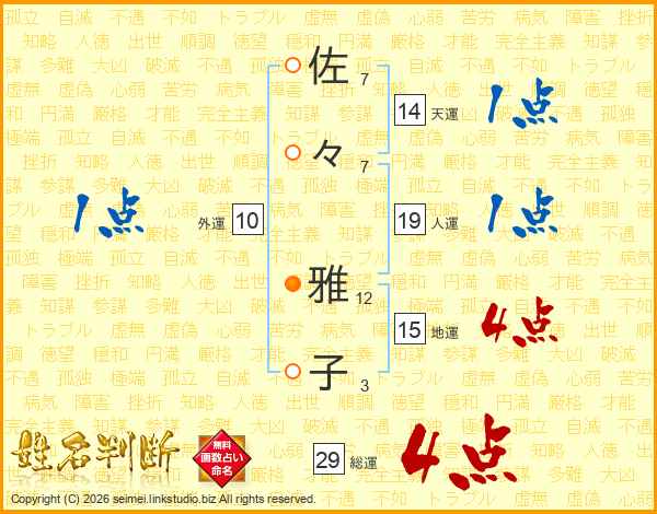 生活面を象徴する運勢です。外部から受ける影響力を表し、結婚運、家庭運や職場、環境への順応性を表します。総運から人運を引いた画数。姓や名が1文字の場合を除く。
