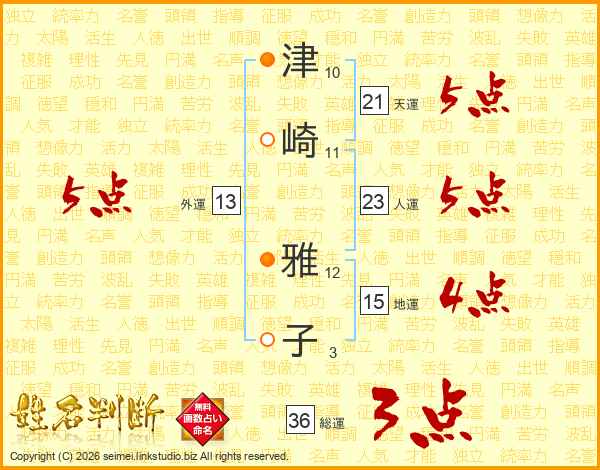 津(10画)崎(11画) 雅(12画)子(3画)