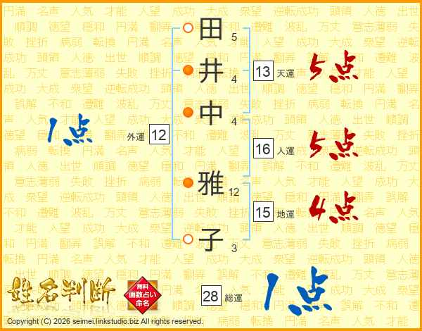 田(5画)井(4画)中(4画) 雅(12画)子(3画)