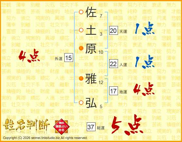佐(7画)土(3画)原(10画) 雅(12画)弘(5画)