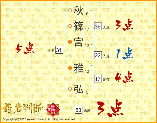 秋(9画)篠(17画)宮(10画) 雅(12画)弘(5画)