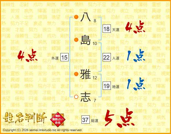 あなたの人生を表す1番重要な運勢です。生涯を通じて影響する総合運となり、主に50歳以降の晩年期に影響を及ぼします。苗字と名前の合計画数。