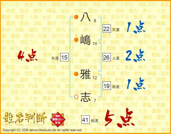八嶋雅志さんの総運は41画の5点!