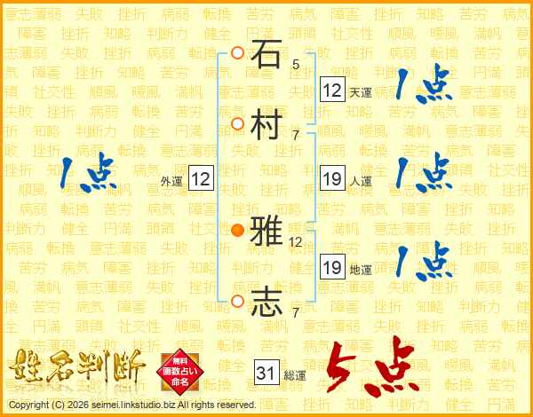 あなたの人生を表す1番重要な運勢です。生涯を通じて影響する総合運となり、主に50歳以降の晩年期に影響を及ぼします。苗字と名前の合計画数。