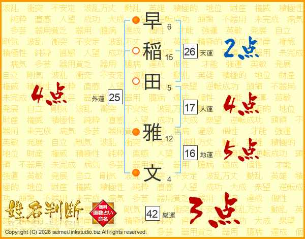 早(6画)稲(15画)田(5画) 雅(12画)文(4画)