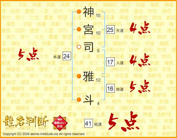 神(10画)宮(10画)司(5画) 雅(12画)斗(4画)