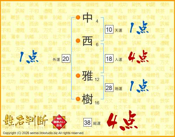 中(4画)西(6画) 雅(12画)樹(16画)