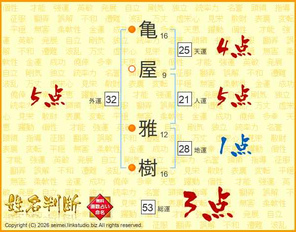 亀(16画)屋(9画) 雅(12画)樹(16画)