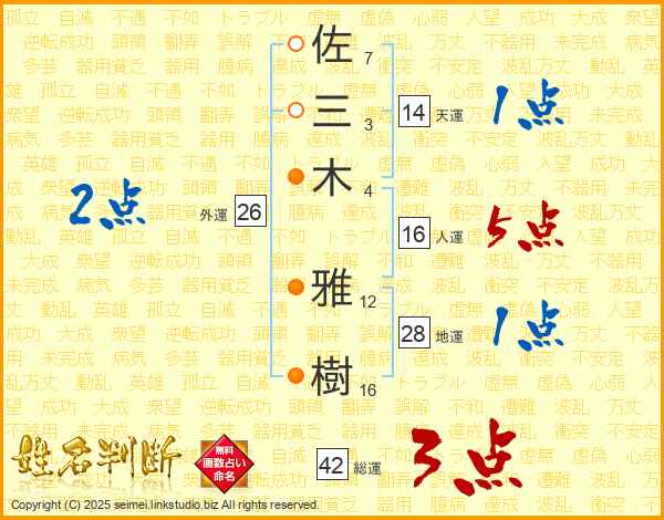 佐(7画)三(3画)木(4画) 雅(12画)樹(16画)