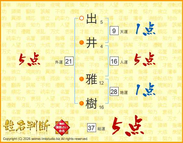 生活面を象徴する運勢です。外部から受ける影響力を表し、結婚運、家庭運や職場、環境への順応性を表します。総運から人運を引いた画数。姓や名が1文字の場合を除く。