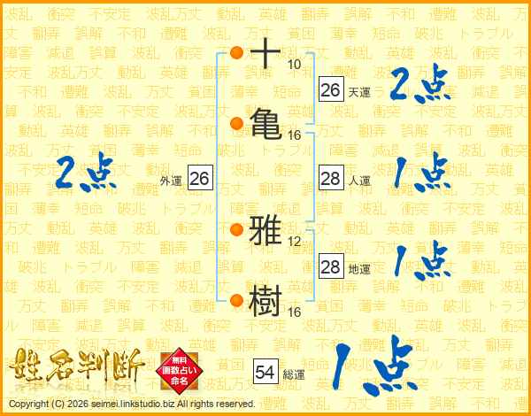 十(10画)亀(16画) 雅(12画)樹(16画)