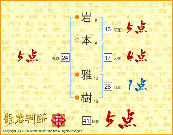 岩(8画)本(5画) 雅(12画)樹(16画)