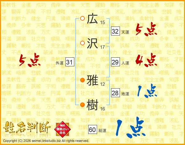 広(15画)沢(17画) 雅(12画)樹(16画)