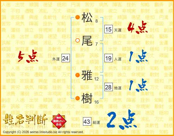 松(8画)尾(7画) 雅(12画)樹(16画)