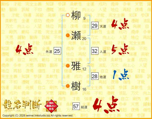 柳(9画)瀬(20画) 雅(12画)樹(16画)