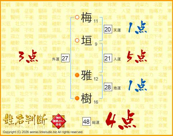 梅(11画)垣(9画) 雅(12画)樹(16画)