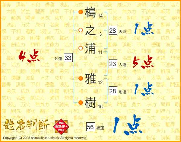 槝(14画)之(3画)浦(11画) 雅(12画)樹(16画)